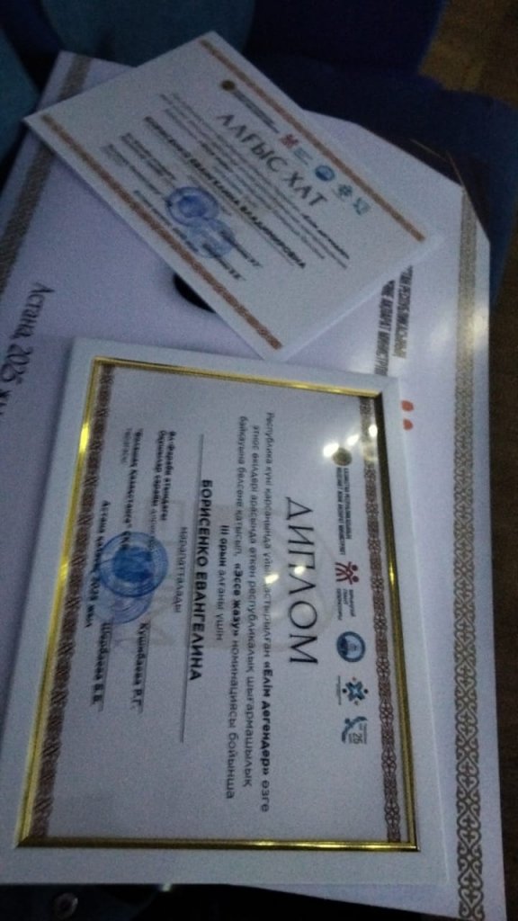 Бүгін, 2025 жылдың 22 қазанында ұлты қазақ емес жастарға арналған республикалық «Елім дегендер» шығармашылық байқауында «Қазақ тілінен эссе байқауы» номинациясы бойынша «Жібек жолы кентінің жалпы білім беретін мектебі» КММ 8-сынып оқушысы Евангелина Борисенко жүлделі ІІІ орынды иеленіп, ақшалай сертификатпен марапатталды.