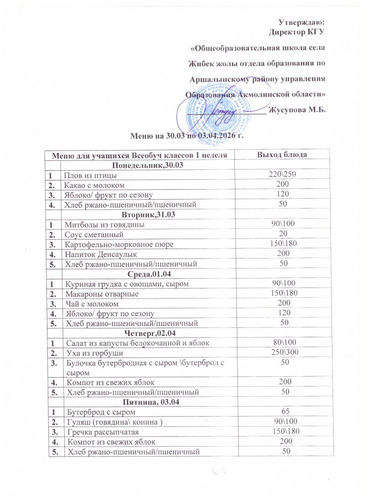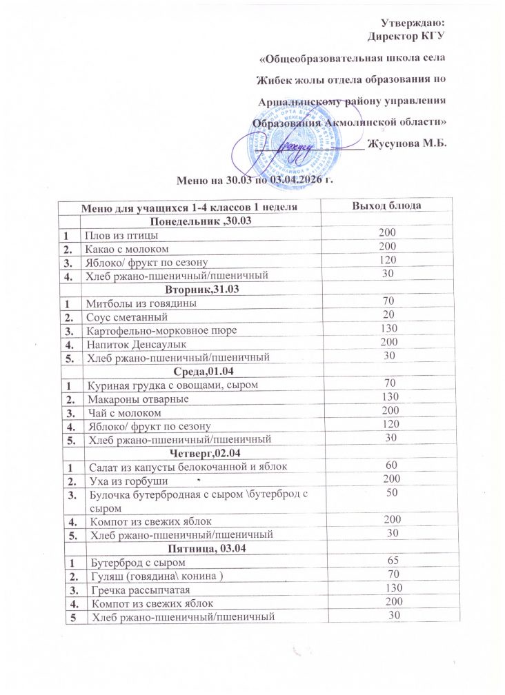 2026 жылғы 30 наурыз – 3 сәуір аралығындағы мектеп ас мәзірі