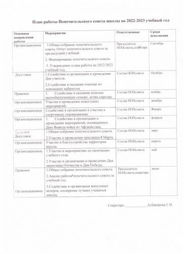 Мектептің Қамқоршылық кеңесінің 2022-2023 оқу жылына арналған жұмыс жоспары.
