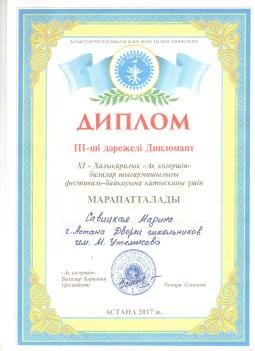 Поздравляем Савицкую Мадину с Дипломом Лауреата 3 степени в номинации "Эстрадный вокал" в III Международном фестивале - конкурсе детского и юношеского творчества.