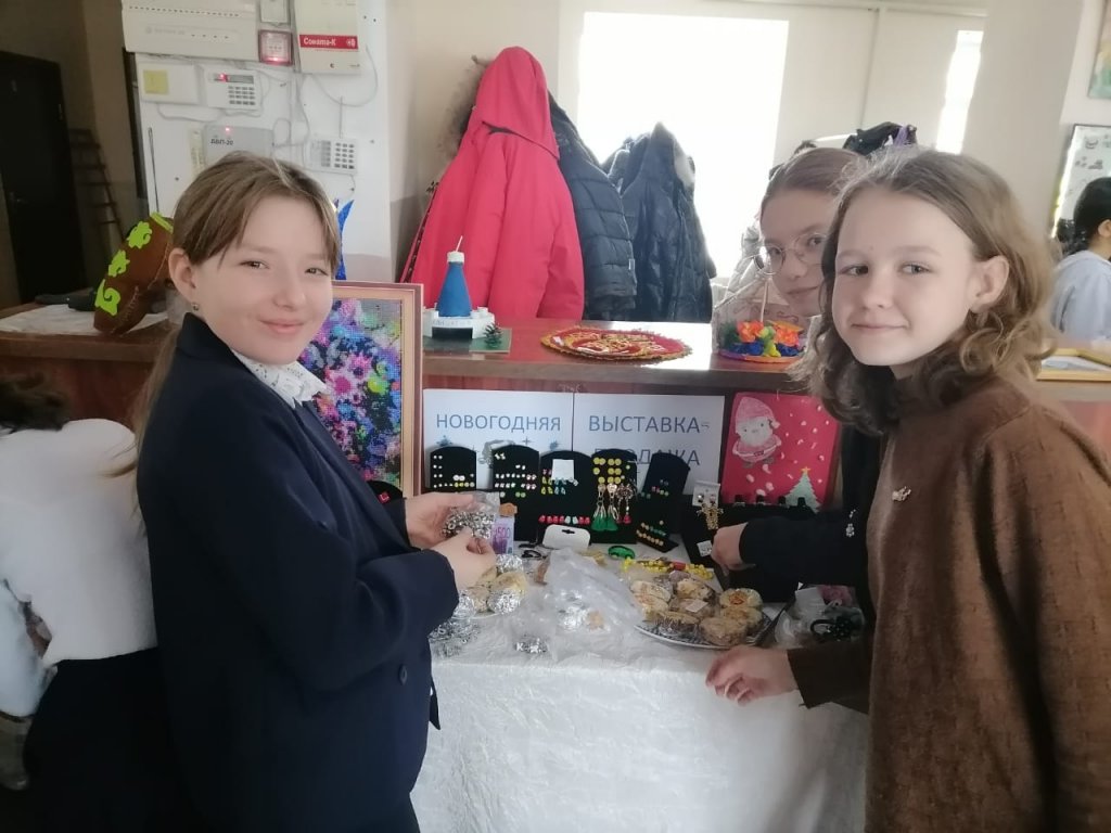 В школе в преддверии Нового года прошла новогодняя выставка продажа, где учащиеся представили картины, сувениры и аксессуары, сделанные своими руками, печенье с предсказаниями и многое другое.